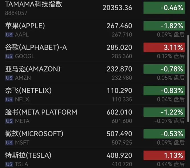 大型科技股多数下跌,谷歌涨超3%,特斯拉涨逾1%,苹果跌近2%,英伟达跌近2%,脸书跌超1%,亚马逊跌0.78%,微软跌0.53%。