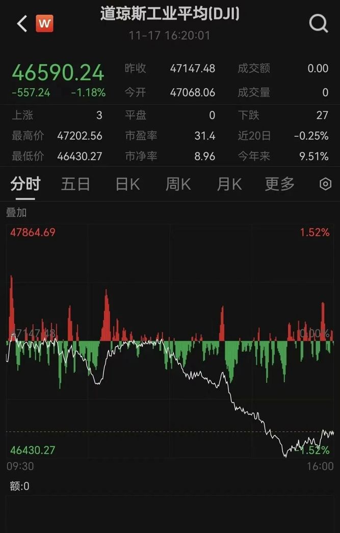 美东时间11月17日周一,美股收跌,道指跌超550点,科技股领跌。英伟达将在周三盘后发布三季度业绩;巴菲特大幅抛售苹果,建仓谷歌母公司Alphabet,Alphabet大涨超3%;油价微跌,金价走弱。