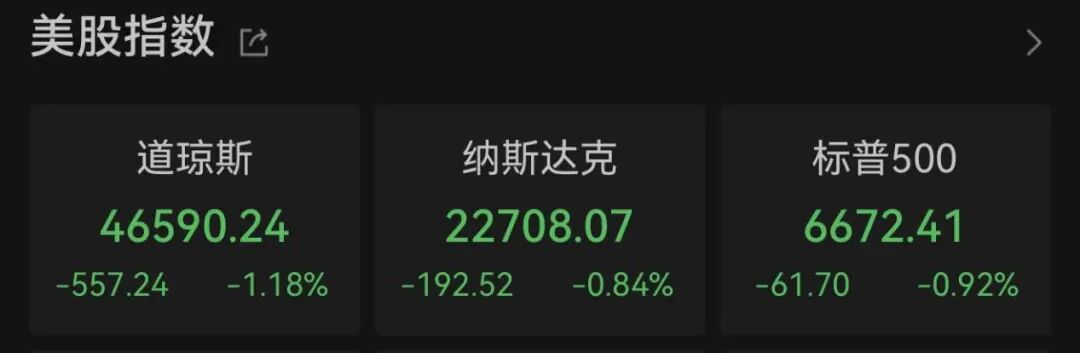截至收盘,道指跌557.24点,跌幅为1.18%;纳指跌192.52点,跌幅为0.84%;标普500指数跌61.70点,跌幅为0.92%。