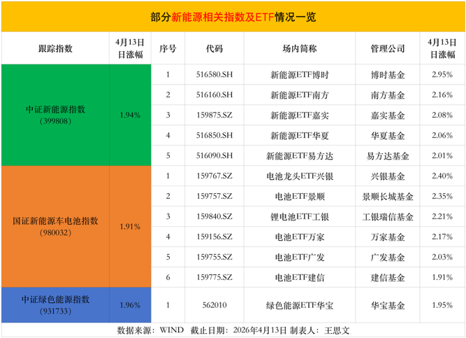 绿色能源ETF华宝(562010)同样位居前十,单日涨幅为1.95%,是聚焦绿色能源全品类的代表性ETF。