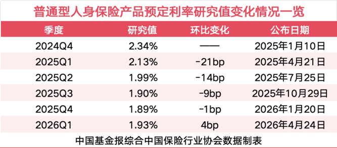 让这波“炒停售”突然熄火的直接原因,在于中国保险行业协会日前发布的一则消息。4月24日,中国保险行业协会组织召开人身保险业利率研究专家咨询委员会2026年一季度例会,保险业专家研究了人身保险产品预定利率研究值,提出当前普通型人身保险产品预定利率研究值为1.93%,较上季度回升4个基点,这是该研究值自披露以来的首次上调。