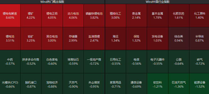 从板块来看,锂电池及相关产业链大涨,精细化工、贵金属、存储器等板块震荡拉升,而能源设备、天然气、通信设备等板块跌幅居前。