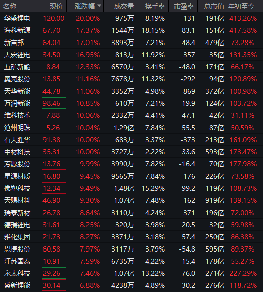 锂矿概念股早盘集体拉升,华盛锂电20%涨停,海科新源、新宙邦、天宏锂电等涨幅居前,沧州明珠、中材科技等多股涨停。