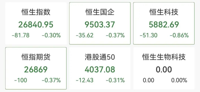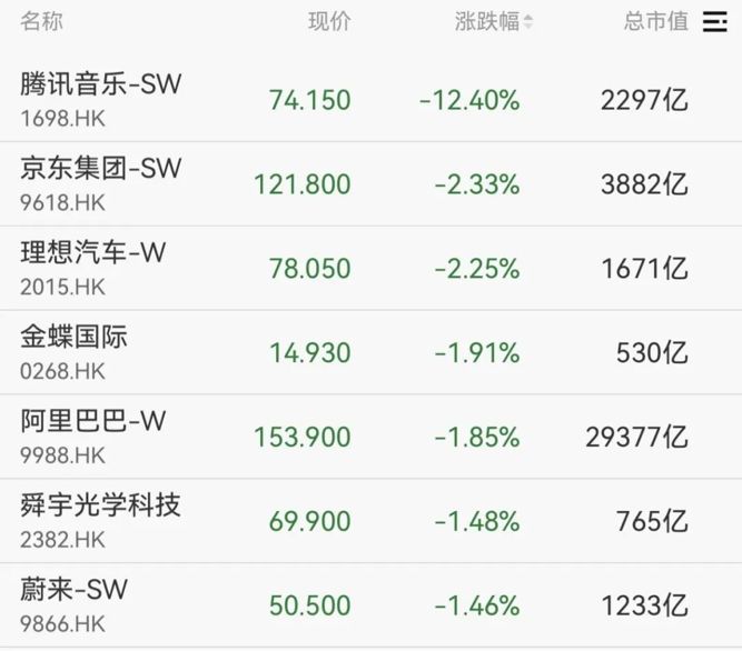 港股方面,三大指数震荡走低,腾讯音乐大跌超12%,京东集团、理想汽车、阿里巴巴等跟跌。