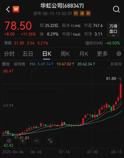 近一个月来,华虹公司股价震荡上涨。8月15日,公司股价大涨11.35%,以78.5元/股报收,最新市值为936亿元。其近几个月涨幅十分可观。