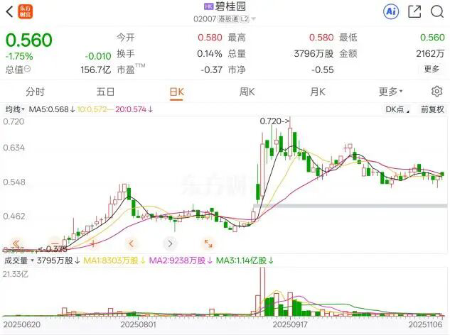 截至11月5日收盘,碧桂园市值为159.5亿港元。