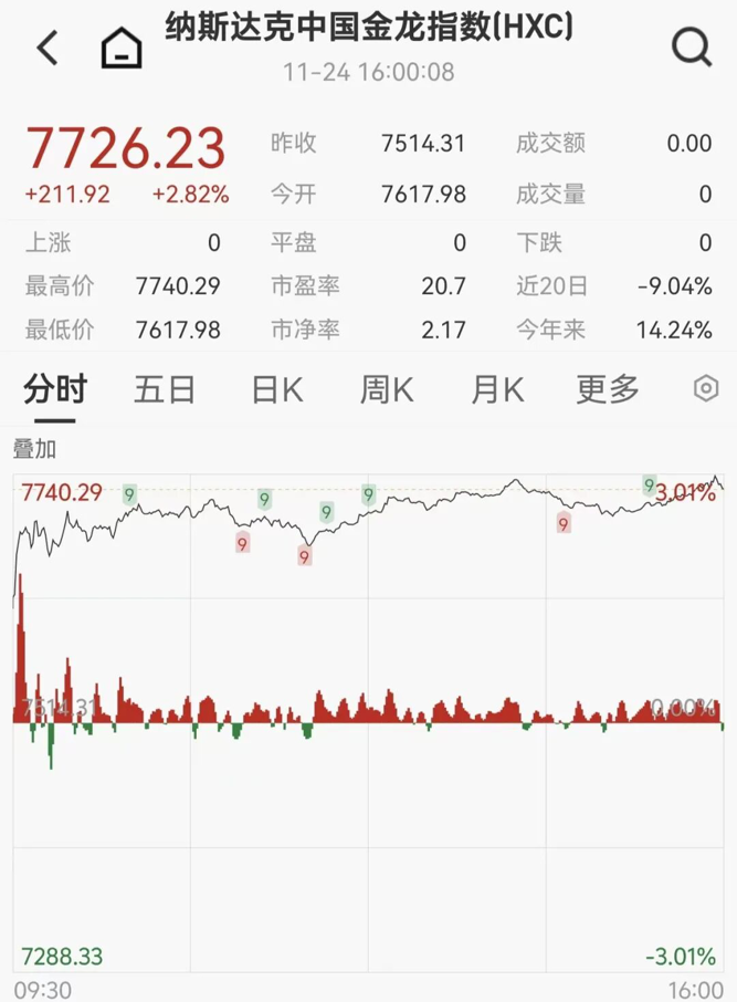 中概股普遍上涨,跑赢大盘。纳斯达克中国金龙指数涨2.82%,万得中概科技龙头指数涨2.95%。
