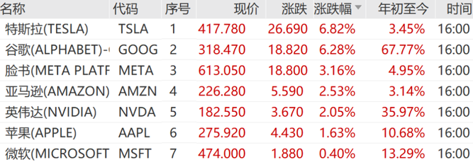 特斯拉涨6.82%,谷歌涨6.28%,脸书涨3.16%,领涨美国科技七巨头。