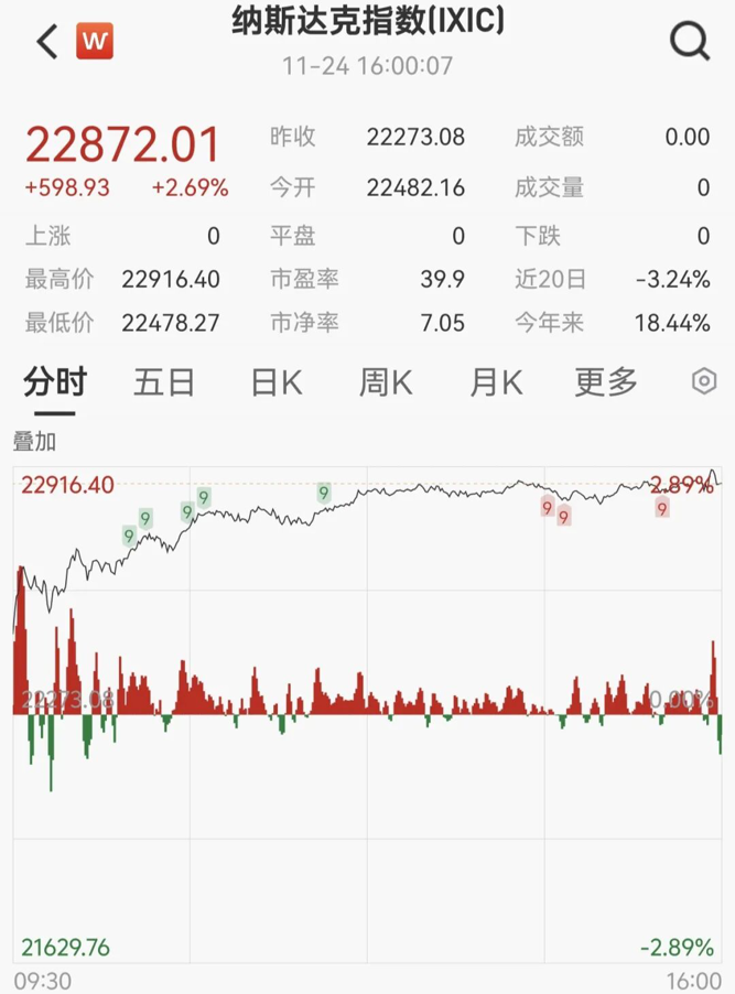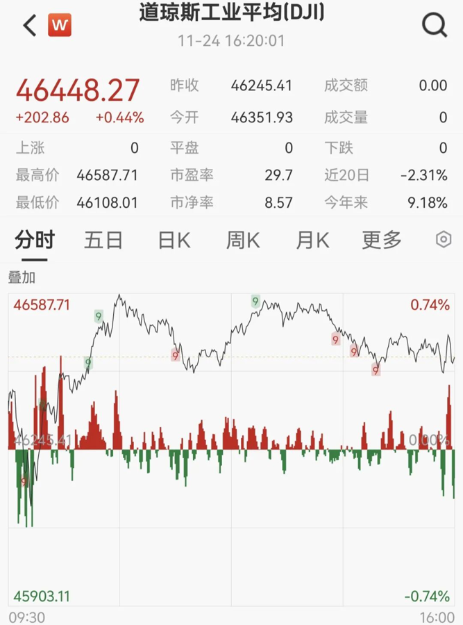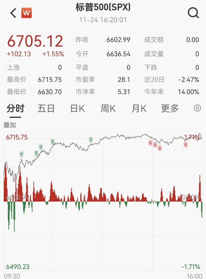 当地时间11月24日,美国三大股指全线收涨,道指涨0.44%,报46448.27点;标普500指数涨1.55%,报6705.12点;纳指涨2.69%,报22872.01点。