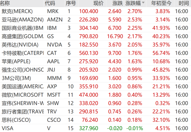默克涨2.70%,亚马逊涨2.53%,IBM涨2.25%,领涨道指成份股。
