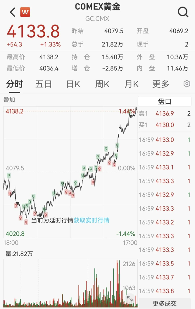 当地时间11月24日,国际贵金属期货普遍收涨,COMEX黄金期货涨1.33%,报4133.8美元/盎司;COMEX白银期货涨2.49%,报51.155美元/盎司。