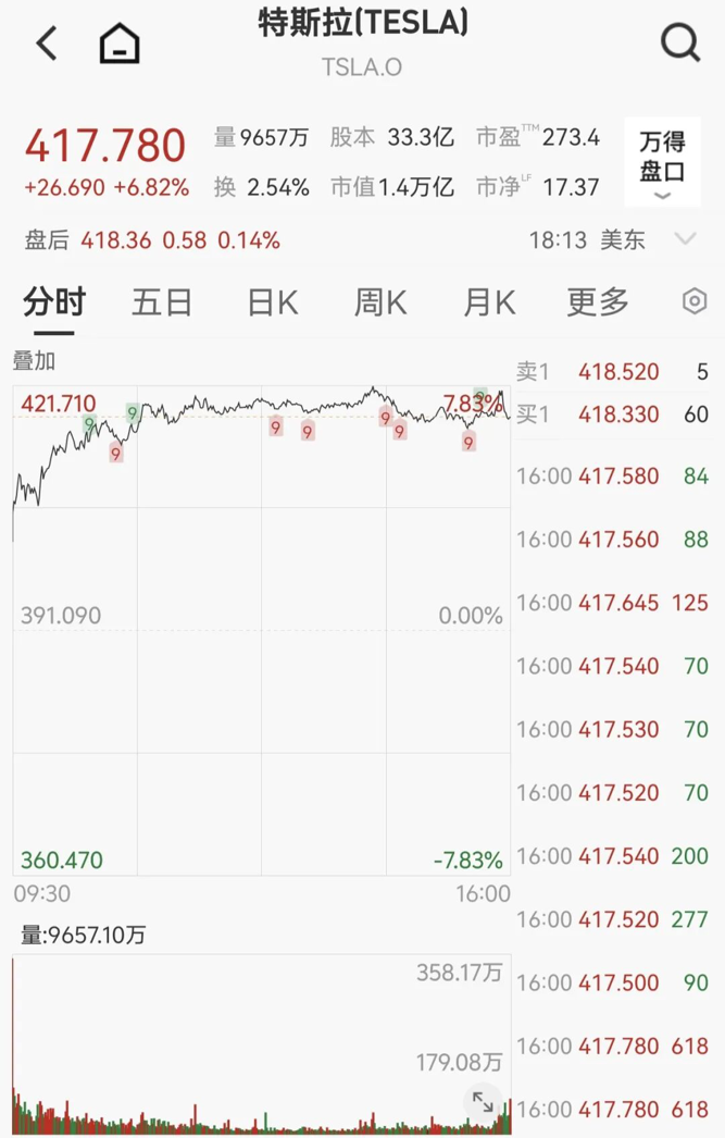特斯拉高开高走,一度大涨7.83%,全天收于417.78美元,涨6.82%,市值一夜之间飙升888.78亿美元,约合人民币超6312亿元。