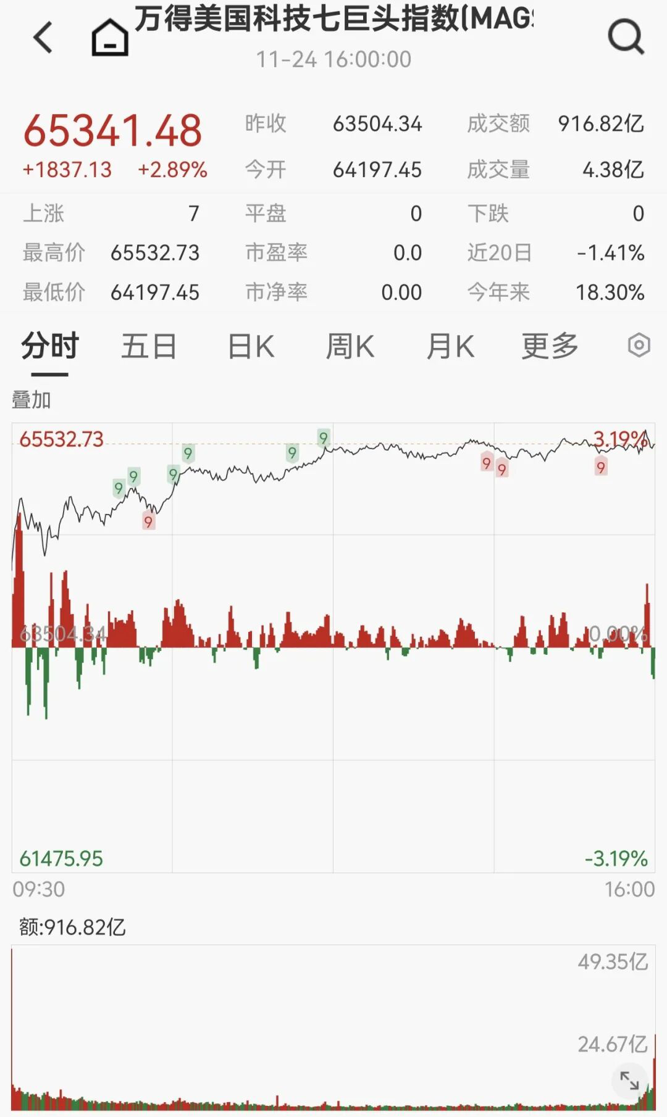 科技股普遍上涨,万得美国科技七巨头指数大涨2.89%。