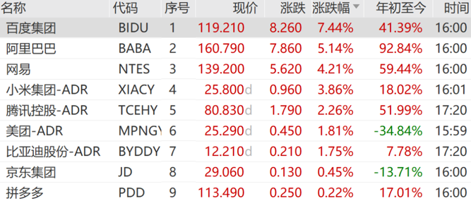 百度集团大涨7.44%,阿里巴巴涨5.14%,网易涨4.21%%,领涨万得中概科技龙头指数成份股。