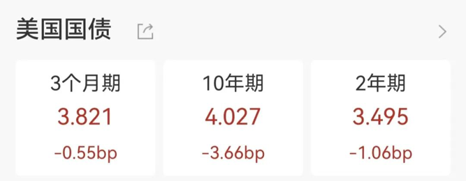 当地时间11月24日,美债收益率集体下跌,2年期美债收益率跌1.06个基点,报3.495%;3年期美债收益率跌1.68个基点,报3.480%;5年期美债收益率跌2.62个基点,报3.593%;10年期美债收益率跌3.66个基点,报4.027%;30年期美债收益率跌4.13个基点,报4.670%。