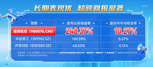 通用航空行业高度聚焦于飞行器研发制造等硬科技领域,高技术壁垒与创新浓度共同塑造了行业的高弹性、高成长属性。以国证通用航空产业指数(指数代码:980076.CNI)为例,作为低空经济领域的代表性指数之一,该指数由50只涉及航材及基础设施、飞行器制造、运营服务及场景应用等通用航空产业相关领域的证券组成。Wind数据显示,截至今年7月23日,自该指数2012年底发布以来复合年平均收益类达10.27%,远超中证军工8.67%和沪深300指数4.12%的同期表现。①