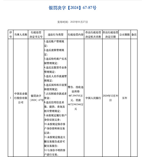 其中,农业银行因12项违法行为被警告,没收违法所得487.59万元,罚款4672.94万元。