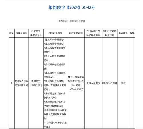光大银行因11项违法行为被警告,没收违法所得201.77万元,罚款1677.06万元。