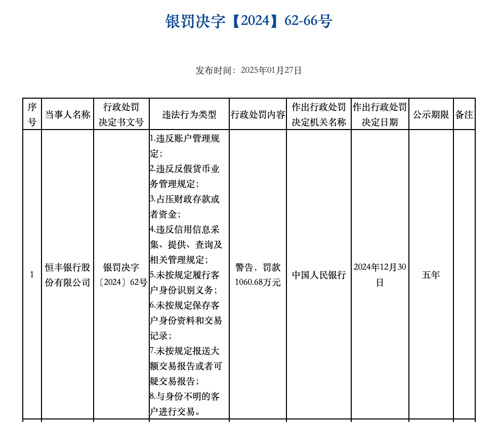 恒丰银行因8项违法行为被警告,罚款1060.68万元。具体违法行为包括:违反账户管理规定;违反反假货币业务管理规定;占压财政存款或者资金;违反信用信息采集、提供、查询及相关管理规定;未按规定履行客户身份识别义务;未按规定保存客户身份资料和交易记录;未按规定报送大额交易报告或者可疑交易报告;与身份不明的客户进行交易。