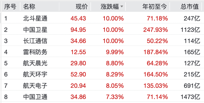 个股方面,雷科防务走出3连板,北斗星通、长江通信、中国卫星、顺灏股份录得10cm涨停。爱乐达大涨14%,航天晨光、航天电子、广联航空、上工申贝等均涨超7%。