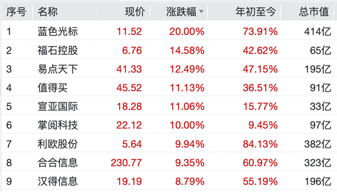 个股方面,蓝色光标录得20cm涨停,德生科技、利欧股份、掌阅科技录得10cm涨停,雷神科技涨超14%,汉得信息涨近9%,易点天下、值得买等冲高。