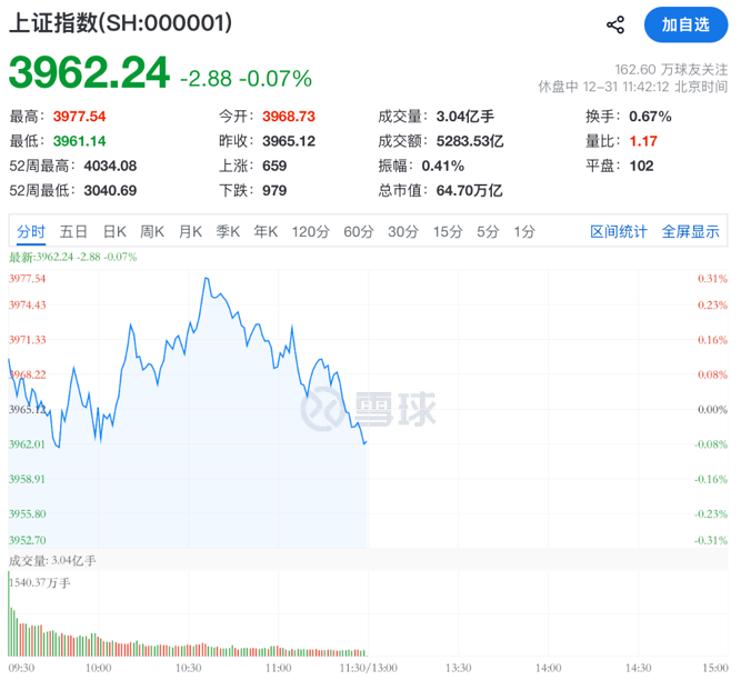 12月31日上午,A股三大股指集体下跌。截至午间收盘,沪指跌0.07%,深证成指跌0.67%,创业板指跌1.1%。