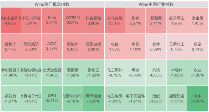 从板块看,AI应用、教育、有色金属板块领涨,商业航天概念股持续活跃;船舶制造、医药商业、化肥等领跌,光模块CPO概念股下挫。