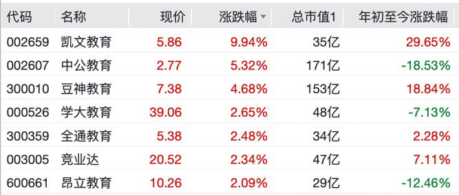 教育板块拉升走高。个股方面,凯文教育录得10cm涨停,中公教育、豆神教育、学大教育、全通教育、竞业达纷纷跟涨。