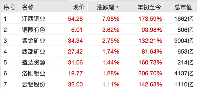 个股方面,江西铜业涨近8%,云南铜业、铜陵有色、精艺股份、紫金矿业等纷纷跟涨。
