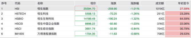 港股方面,恒生指数、恒生科技指数、恒生中国企业指数等全线下跌。个股方面,阿里巴巴跌超1%,比亚迪股份跌超2%,腾讯控股、小米集团、中芯国际、网易、美的集团纷纷下跌。