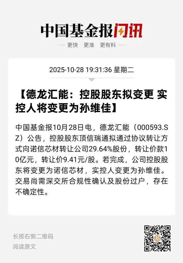 10月28日晚,停牌两个交易日的德龙汇能公告,公司控股股东北京顶信瑞通科技发展有限公司(以下简称顶信瑞通)与东阳诺信芯材企业管理合伙企业(有限合伙)(以下简称诺信芯材)签订了《股份转让协议》,顶信瑞通拟通过协议转让方式向诺信芯材转让公司股份1.06亿股,占公司总股本的29.64%。本次股份转让价格为9.41元/股,股份转让的交易价款合计为10亿元。