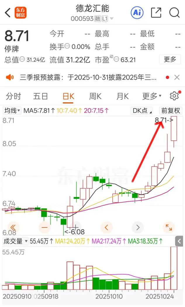 德龙汇能股票将于2025年10月29日开市起复牌。停牌前公司股价连续大涨,尤其停牌前一天的10月24日录得涨停,市值涨至31.24亿元。