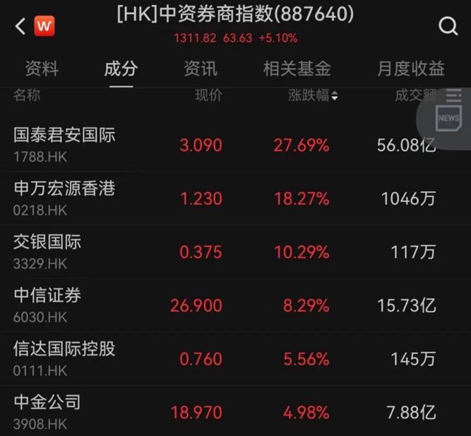 牛市“旗手”大爆发。国泰君安国际大涨超27%,申万宏源香港、交银国际涨超10%。券商股走高带动金融股集体上涨。