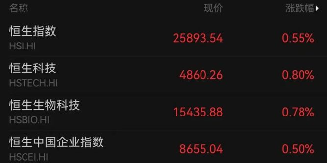 本周(4月8日至4月10日),恒生指数累计上涨3.09%,截至4月10日收盘,报25893.54点;恒生科技指数累计上涨3.87%,截至4月10日收盘,报4860.26点;恒生国企指数累计上涨2.34%,截至4月10日收盘,报8655.04点。