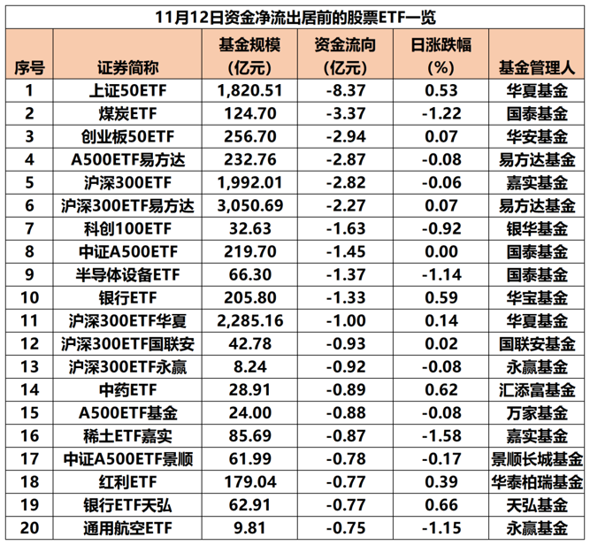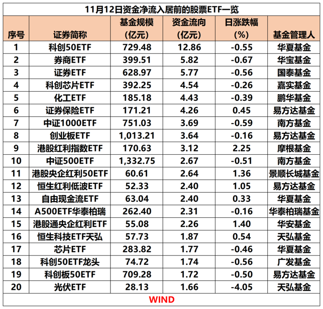 11月12日,三大指数小幅低开后震荡调整,保险、石油、银行等板块轮番演绎。股票ETF整体资金净流入91.6亿元,证券、化工、保险等相关热门主题ETF成为“吸金”主力,上证50指数、创业板50指数、中证A500指数等宽基ETF成为“失血”大户。
