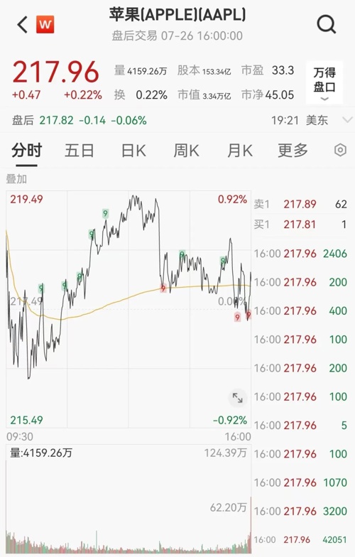 美东时间7月26日,苹果股价微涨0.22%,收于217.96美元。