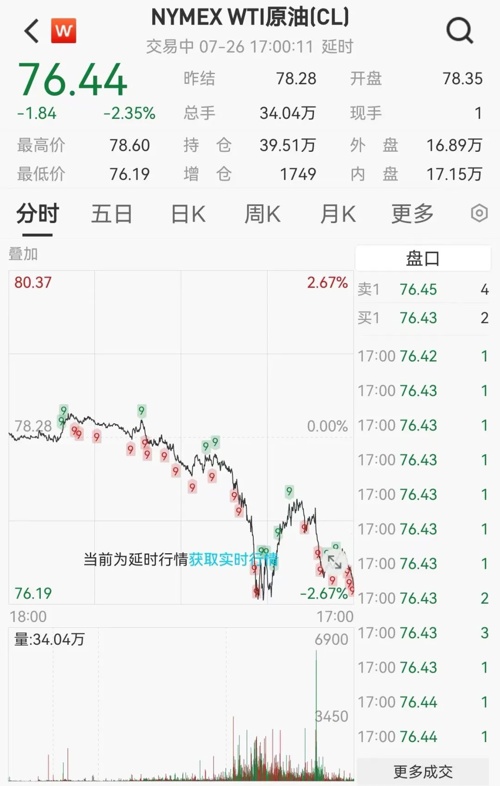 国际油价全线走低。美油8月合约跌2.35%,报76.44美元/桶,全周跌2.8%。布油9月合约跌2.11%,报79.67美元/桶,全周跌3.58%。