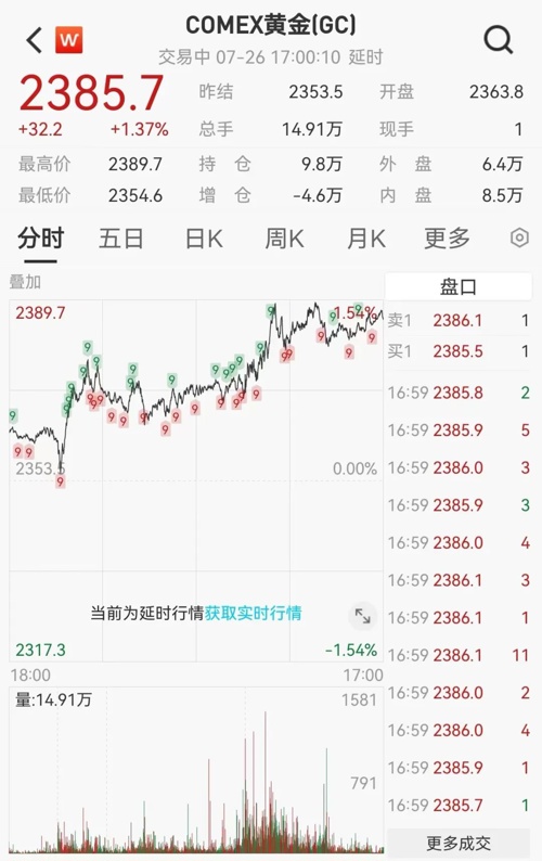美东时间7月26日,国际贵金属期货普遍收涨。COMEX黄金期货涨1.37%,报2385.7美元/盎司,全周跌0.56%。COMEX白银期货涨0.34%,报28.07美元/盎司,全周跌4.19%。