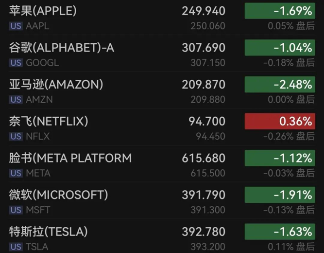 大型科技股集体下跌,亚马逊跌超2%,微软跌近2%,特斯拉、苹果、脸书、谷歌跌超1%,英伟达跌0.84%。