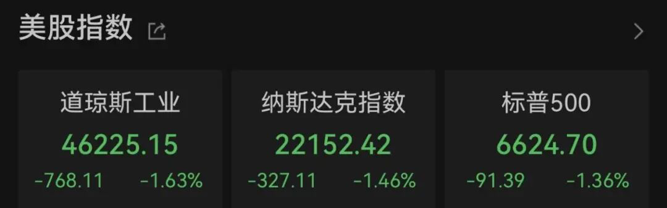 道指跌768.11点,跌幅为1.63%,报46225.15点;纳指跌327.11点,跌幅为1.46%,报22152.42点;标普500指数跌91.39点,跌幅为1.36%,报6624.70点。