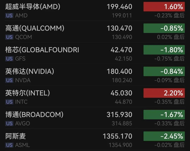 芯片股多数下跌,费城半导体指数跌0.53%,迈威尔科技跌超3%,阿斯麦跌逾2%,德州仪器跌超1%,博通跌超1%;涨幅方面,英特尔涨超2%,超威半导体涨逾1%。
