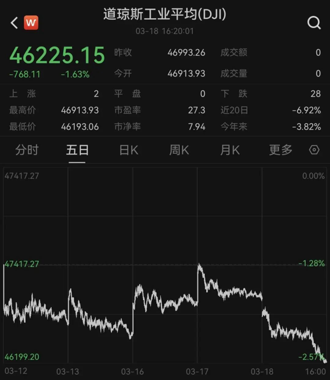美东时间3月18日(周三),美股收跌,道指重挫760点创年内新低。美联储维持利率不变,机构预计今年降息一次。中东局势紧张,布伦特油价突破107美元。美联储决议公布后,黄金延续跌势。