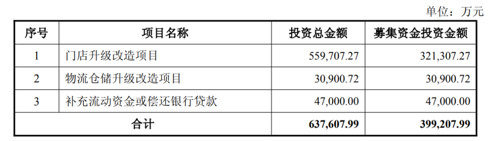 根据公告,扣除发行费用后的净额将用于门店升级改造项目、物流仓储升级改造项目及补充流动资金或偿还银行贷款。其中,门店升级改造项目拟使用募集资金32.13亿元,物流仓储升级改造项目拟使用募集资金3.09亿元,补充流动资金或偿还银行贷款拟使用募集资金4.7亿元。