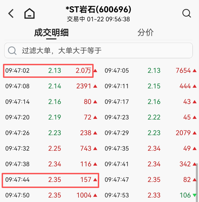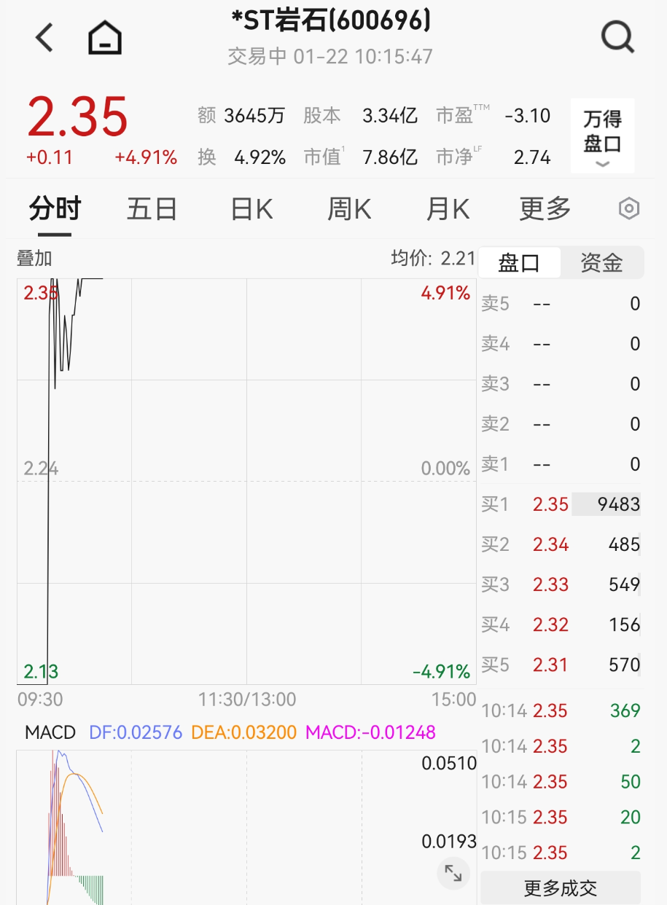 1月22日,*ST岩石开盘跌停,报2.13元/股。盘中忽遭资金涌入,*ST岩石在1分钟内走出“地天板”。