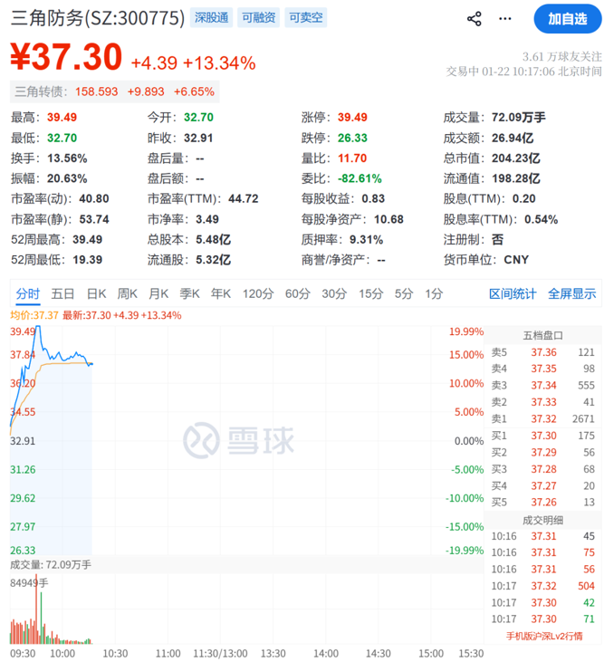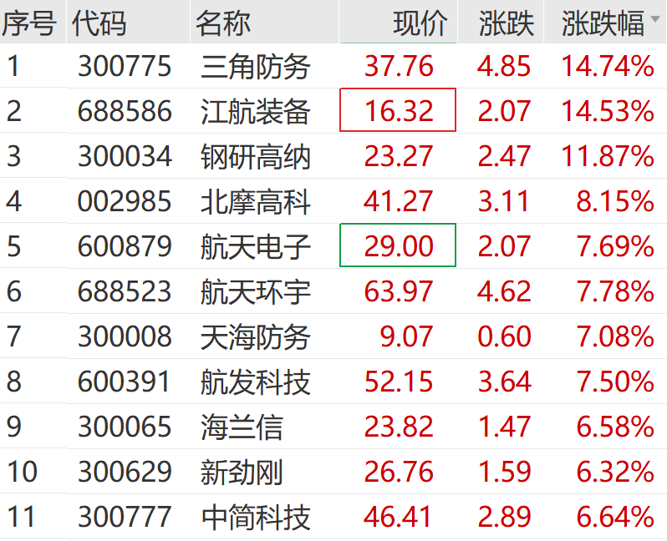 国防军工板块持续拉升,大飞机、航母、商业航天等方向领涨。三角防务盘初触及20cm涨停,江航装备、钢研高纳、北摩高科、航天电子等多股走高。