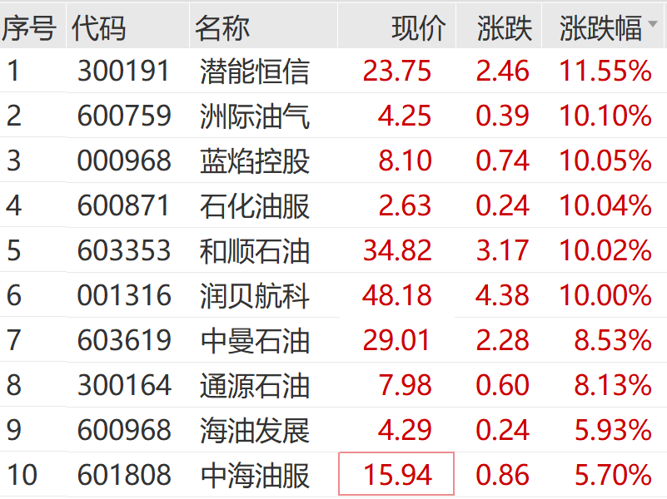 1月22日,石油石化板块高开高走。洲际油气、蓝焰控股、石化油服、和顺石油等盘初拉涨停,潜能恒信涨超10%,通源石油、中曼石油等跟涨,“三桶油”亦有明显涨幅。