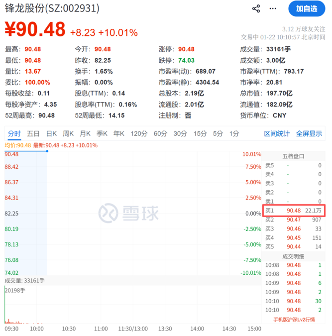 1月22日,锋龙股份在竞价阶段再度涨停,走出17连板。截至发稿,锋龙股份报90.48元/股,买一超22万手。