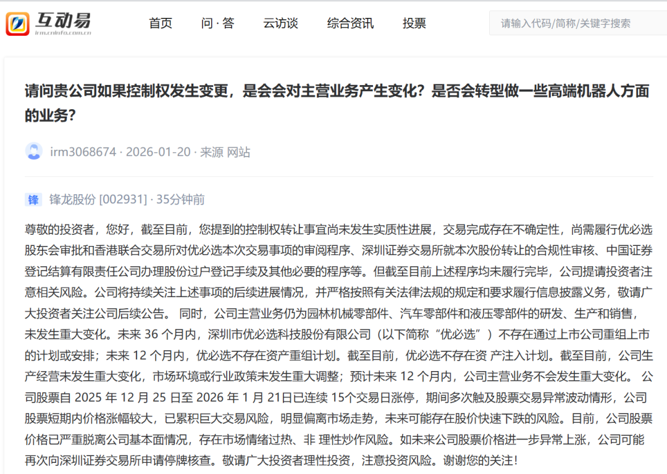 当日,锋龙股份在互动易平台上回复投资者提问称,未来36个月内,深圳市优必选科技股份有限公司不存在通过上市公司重组上市的计划或安排;未来12个月内,优必选不存在资产重组计划。截至目前,优必选不存在资产注入计划。