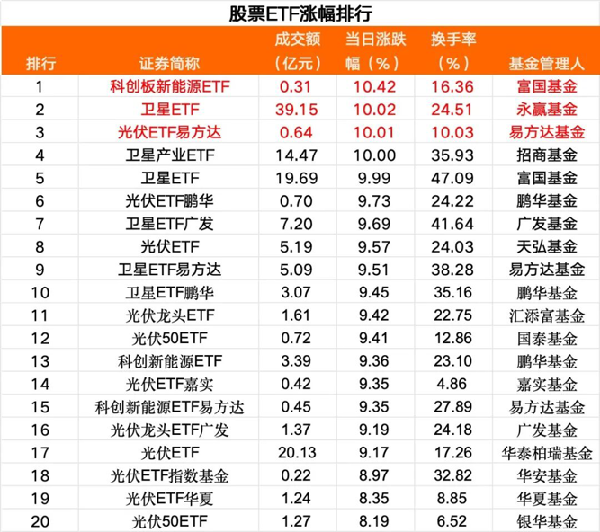 从股票ETF二级市场表现看,光伏、卫星板块领涨。当日涨幅前十大股票ETF中,光伏新能源板块占据4席,卫星占据6席。