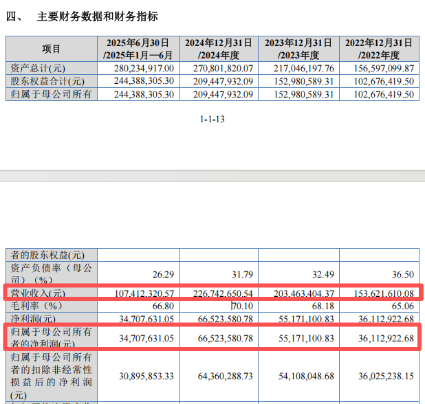 2022年至2024年及2025年上半年,海菲曼的营业收入分别为1.54亿元、2.03亿元、2.27亿元及1.07亿元,归母净利润分别为3611.29万元、5517.11万元、6652.36万元及3470.76万元。